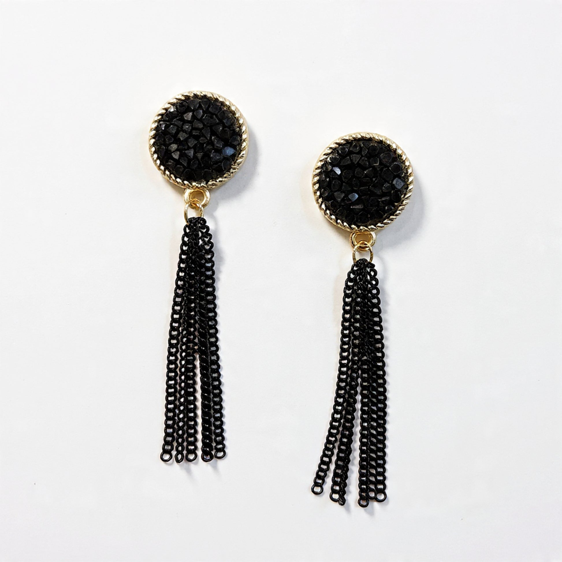 Make a bold style statement with these stunning Black Crystal Tassel Earrings, designed to add drama and elegance to any outfit. Featuring a textured black crystal stud top with cascading black chain tassels, these earrings are perfect for evening parties, festive occasions, and glam looks.