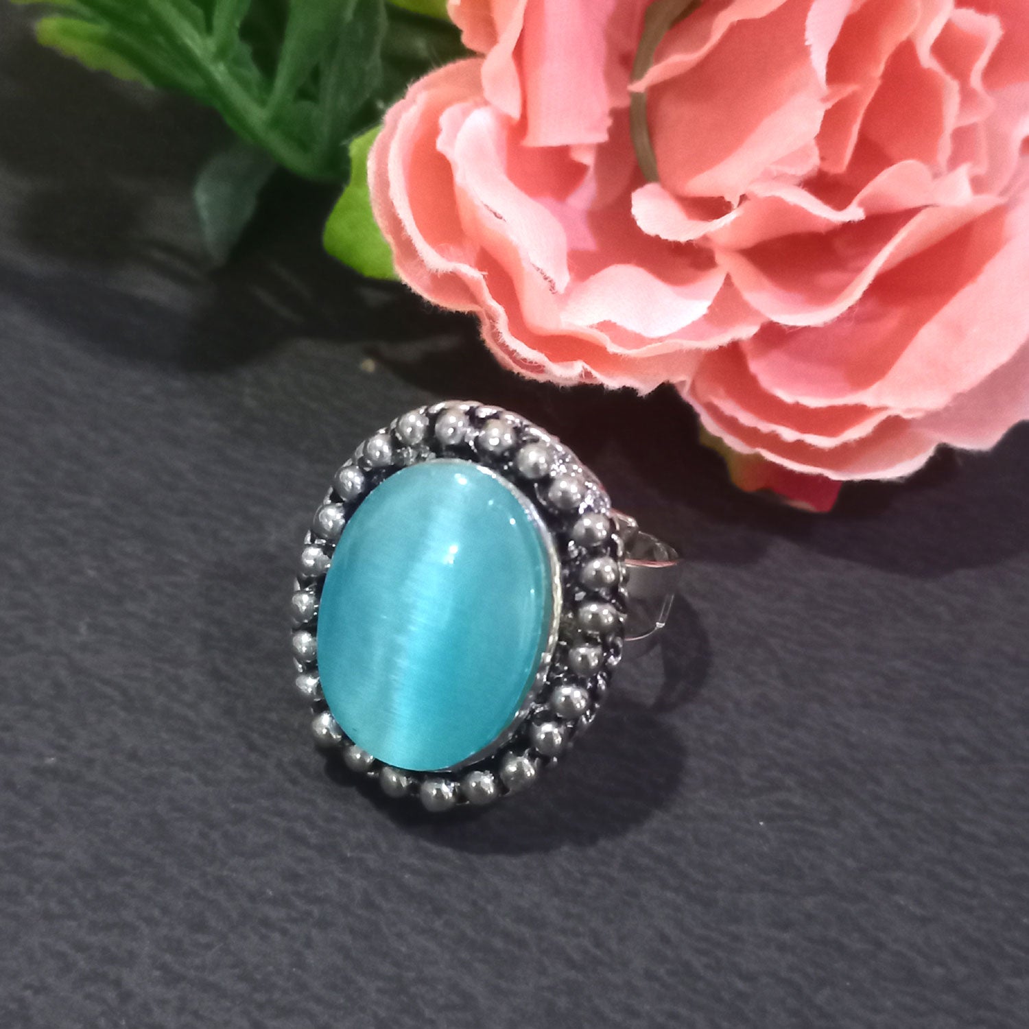 Make a bold yet elegant style statement with this beautiful oval stone ring, designed to stand out with timeless charm. Featuring a smooth blue oval stone, this ring is framed with delicate beaded detailing that adds a vintage-inspired touch.