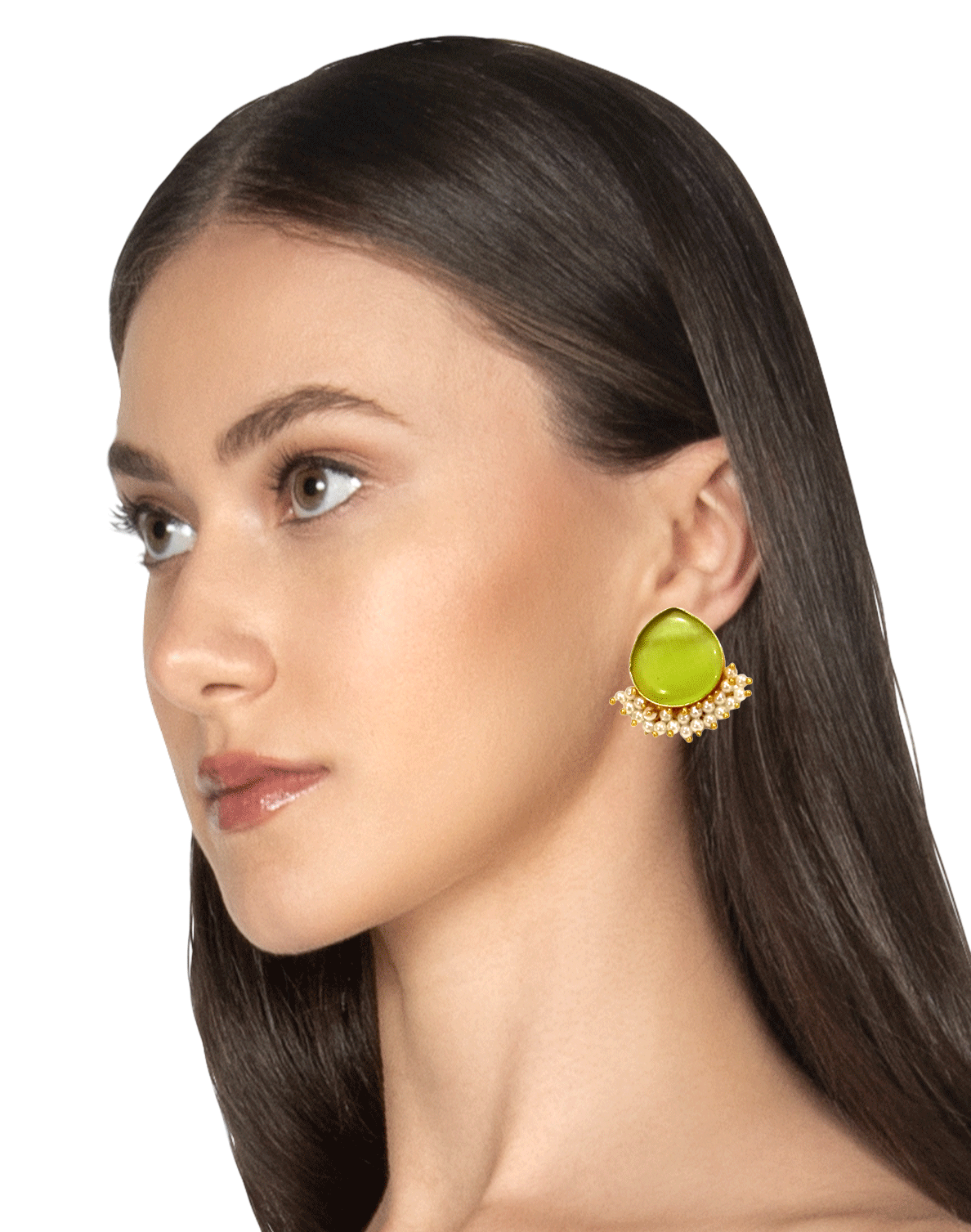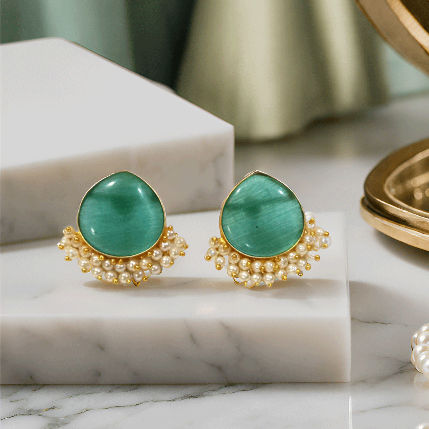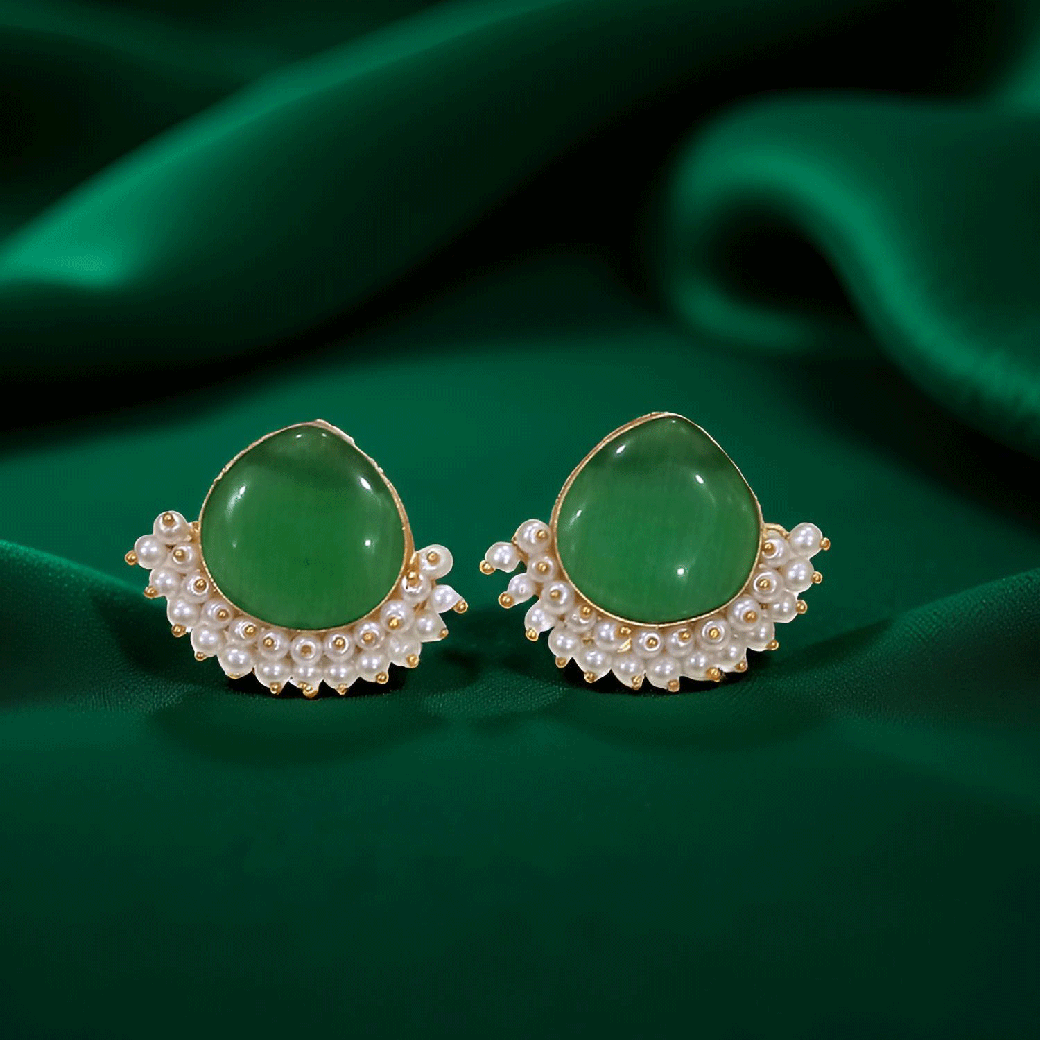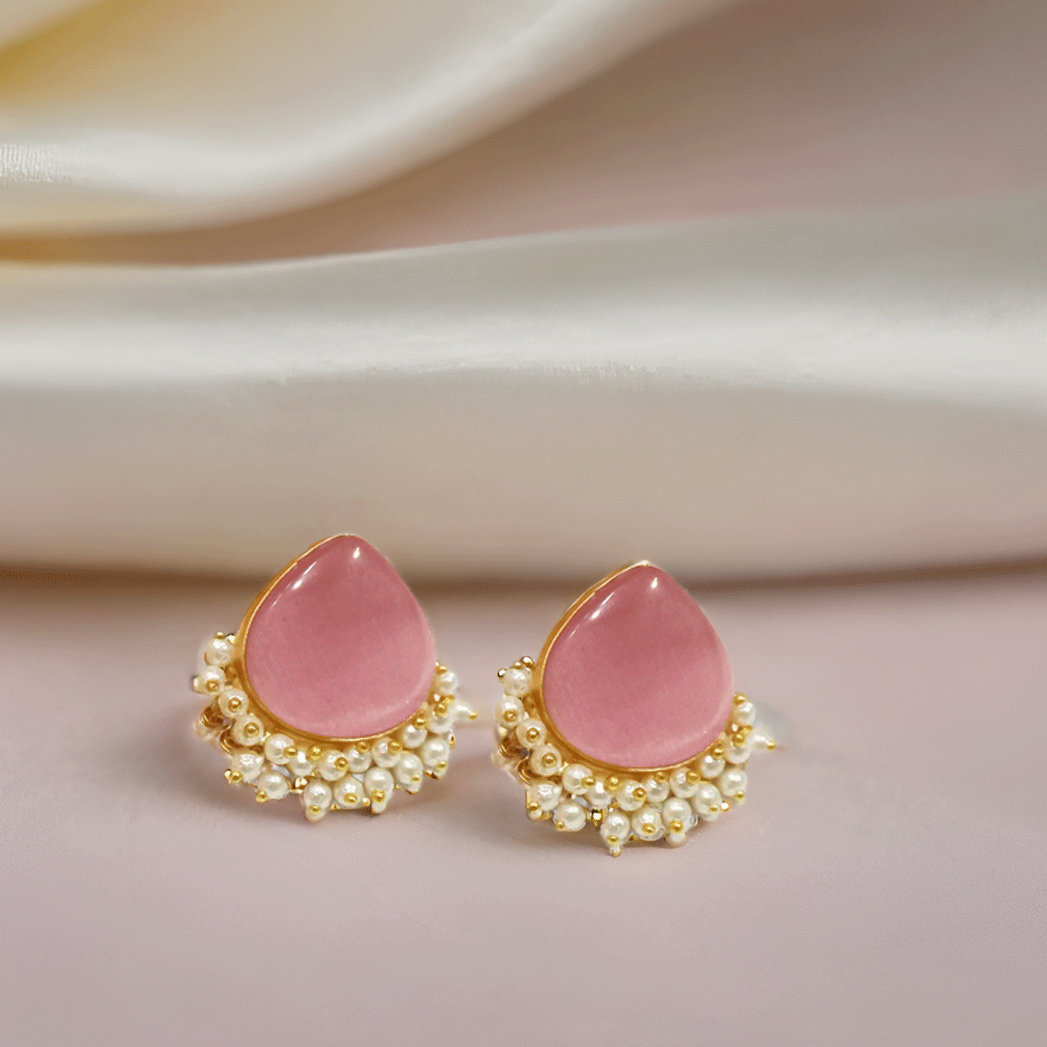 Add understated elegance to your jewellery collection with these beautifully crafted pearl drop stud earrings. Designed with a soft, translucent teardrop stone framed in a gold-tone setting, these earrings are delicately accented with tiny pearl clusters that lend a graceful, feminine charm.